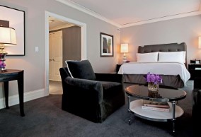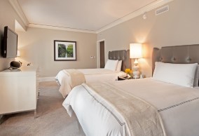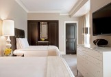 The rooms are equipped with modern amenities such as free Wi-Fi, flat-screen TVs, iPod docking stations, and espresso machines. The large, marble-floored bathrooms are fitted with soaking tubs, separate showers, and high-end toiletries.