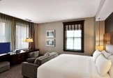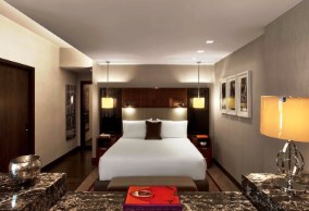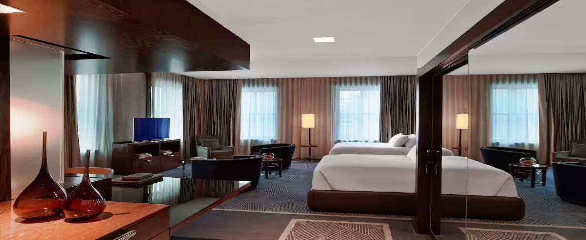 The hotel features 160 guest rooms and suites that blend modern design and luxury amenities, such as custom-made furnishings and lavish marble bathrooms.
