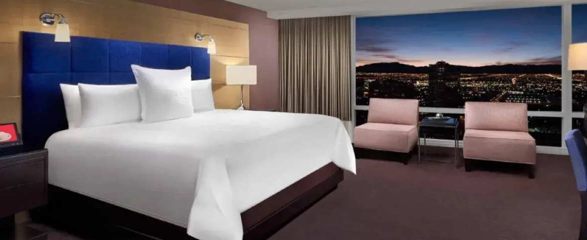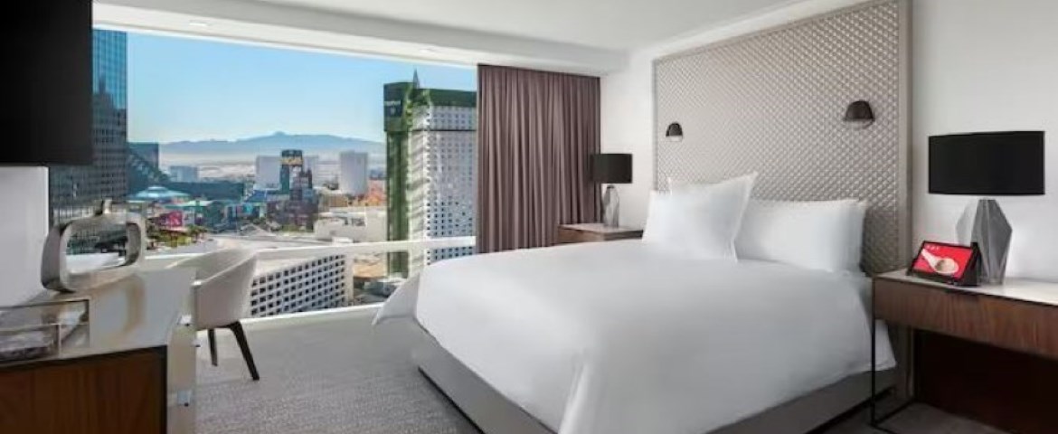 This fancy room has a great view of the Las Vegas Strip. It has modern technology with a big TV and a touch screen beside the bed to control the room. You can also find a small fridge with drinks and snacks, soft and cozy bathrobes, and a big bathtub to relax in. |