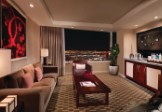 This is a big suite with great views of Las Vegas. There's a big TV in the living room and a smaller one in the bedroom. You can find a small fridge with drinks and snacks, and there's a touch screen beside the bed to control the room. You can also watch TV while in the bathroom, and there's a separate area for getting ready with a private bathroom. |