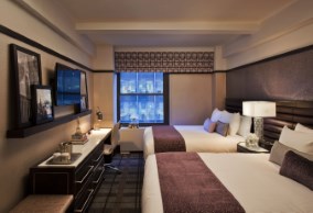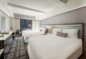 Deluxe Two Queen room offers two queen beds, 46” Samsung LED Full HD television, iDoc mp3 docking stations, desk and dresser with integrated velvet cushioned bench and white marble tops and free cable channels. |
